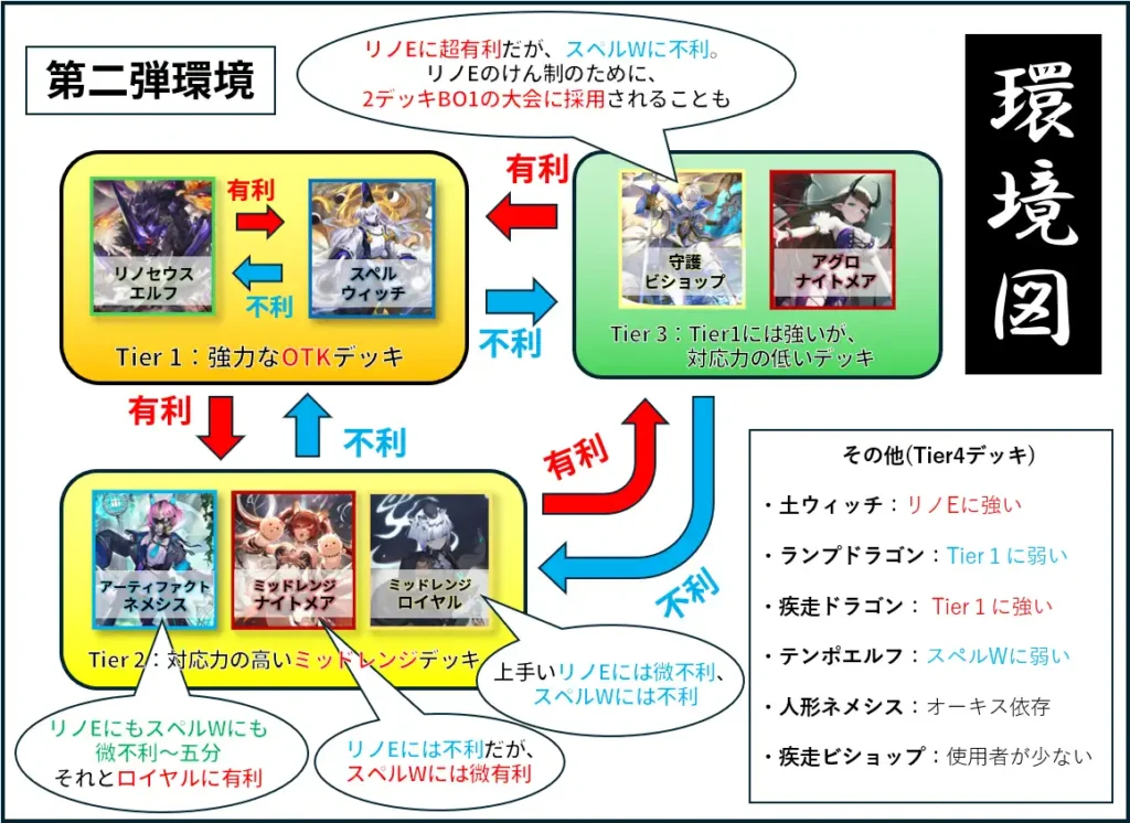 まず、多くのミッドレンジデッキに対して有利を取れる「リノセウスエルフ」と「スペルウィッチ」がTier1です。