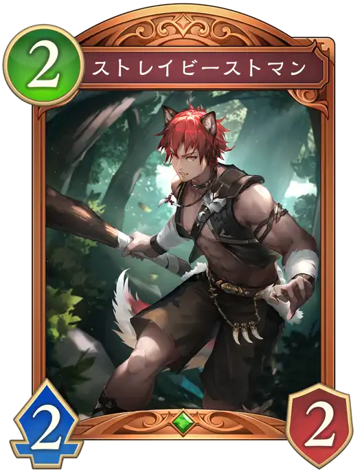 今のエルフの1コストは優秀な除去札だらけであり、フェアリーですら突進を持っている中、この「ストレイビーストマン」は盤面関与ができないので、わざわざ採用する必要がありません(1コスト2枚でよいです)。